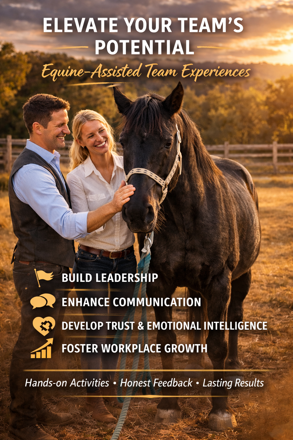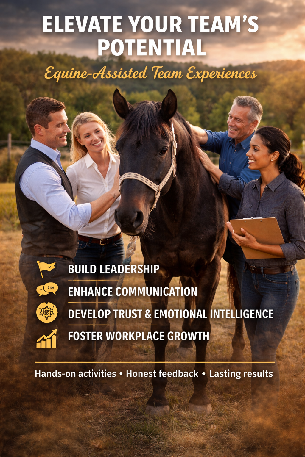 Equine-assisted team experiences that build leadership, trust, communication, and emotional intelligence through hands-on activities, honest feedback, and powerful insights—designed for lasting workplace growth.