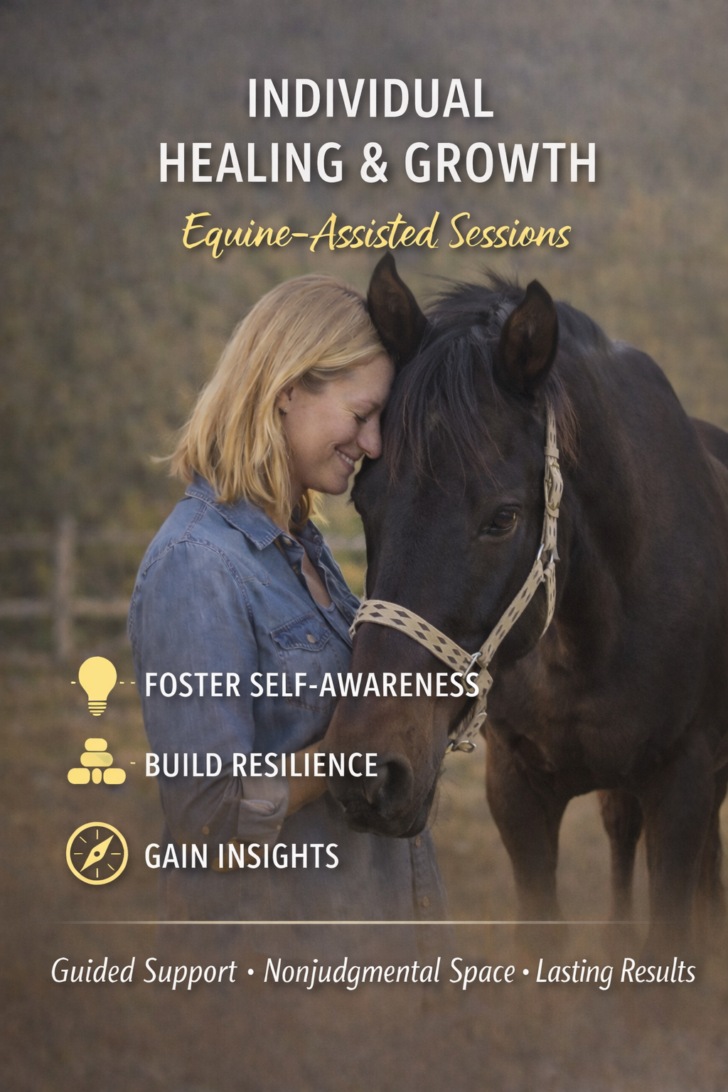 Private, one-on-one equine-assisted sessions for youth and adults, supporting healing, self-awareness, and resilience. Flexible scheduling, meaningful results, and guided support—begin your journey.